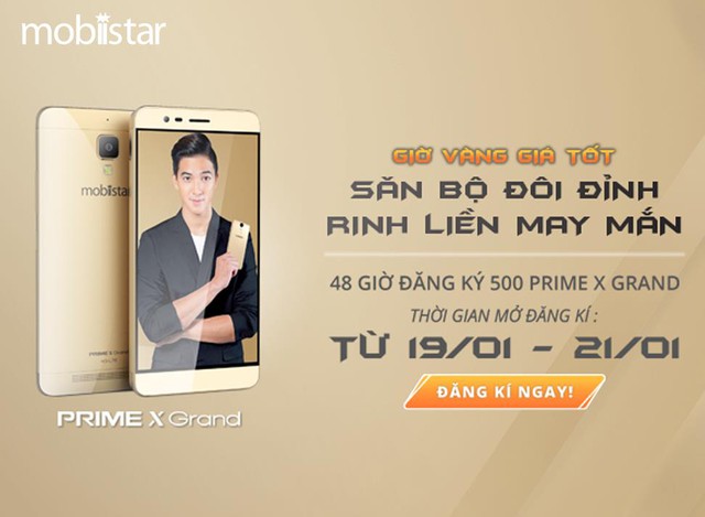 Nhằm gia tăng cơ hội sở hữu smartphone cao cấp Prime X Grand trước ngày lên kệ, Mobiistar đã chính thức tung ra đợt “bán hàng chớp nhoáng” (flashsale) chỉ trong 48 giờ tại trang http://giovang.mobiistar.vn, giảm ngay 1.000.000 VND khi đặt mua sản phẩm.